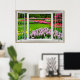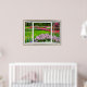 The artwork creates the illusion of having a window that is encased by a a white bay frame. The illusion makes you feel as though you're looking out at a beautiful lush spring garden.