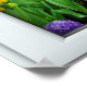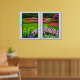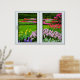The artwork creates the illusion of having a window that is encased by a a white frame. The illusion makes you feel as though you're looking out at a beautiful lush spring garden.