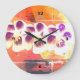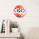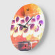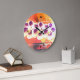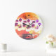 White and purple flowers, yellow, orange,red background. Abstract art collage design on wall clock.