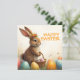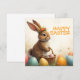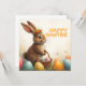 A cute Easter bunny with a flower crown sits lovingly amidst colourful Easter eggs. He holds a small wicker basket with painted eggs in his paws. The scene is surrounded by delicate spring flowers and warm light. The inscription "Happy Easter" shines above the bunny in cheerful orange - a warm greeting that captures the lightness and joy of the spring festival.