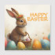 A cute Easter bunny with a flower crown sits lovingly amidst colourful Easter eggs. He holds a small wicker basket with painted eggs in his paws. The scene is surrounded by delicate spring flowers and warm light. The inscription "Happy Easter" shines above the bunny in cheerful orange - a warm greeting that captures the lightness and joy of the spring festival.