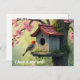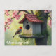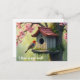 A red-headed bird at a tile-roofed birdhouse placed in a flowring cherry tree creates a lovely change of address postcard that's perfect for anyone who loves birds, flowers, and nature.
