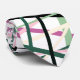 This necktie has a design of repeating blocks of lines that that cross each other in pink, darker pink, light green, darker green, cream, and black.