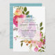 Elegant and modern floral wedding invitation features a background of delicate watercolor spring flowers in pink, blue and purple.