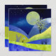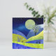 An abstract landscape depicting rolling hills with a blooming spring tree and plants and a moon and stars in shades of blue, cyan, yellow and pink.