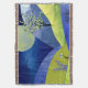 An abstract landscape depicting rolling hills with a blooming spring tree and plants and a moon and stars in shades of blue, cyan, yellow and pink.