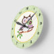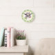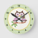 Spring owl with green plaid border wall clock, featuring a cute spring owl in purple and dark brown holding a flower in her beak (bill) on a branch with green leaves and green plaid pattern border on ivory background. You can change text and add your monogram or initials. An adorable, feminine design for owl lovers kids or women. Some elements by Trina Clark.