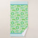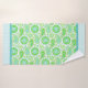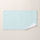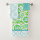 Stylish bath towel set done in turquoise green, yellow, white and aqua. The bath towel is done in a colourful paisley pattern with the end done in a turquoise and white quatrefoil pattern with an aqua band border. The wash cloth is done in a solid aqua blue and the hand towel is done in the turquoise and white quatrefoil pattern. Lovely set that will add colour and cheerfulness in your bathroom.