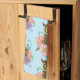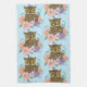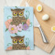 Cute little brown owl sitting amongst pastel pink, peach, and purple Spring flowers in a backdrop of light blue