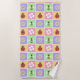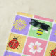 Pastel pink, yellow, purple, and green squares are adorned with ladybugs, dogwood blossoms, daisies, and honeybees and then bordered by tight white stitching to create a fun and sweet spring patch-like pattern.