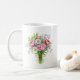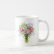 A beautiful hand-tied spring bouquet in rich watercolor featuring soft pink peonies, bright white daisies, delicate periwinkle forget-me-nots, trailing lilac sweet peas, and fresh green leaves with a rustic jute twine bow. A tiny ladybug adds a charming touch. Gorgeous botanical art on a classic white ceramic mug perfect for morning coffee or tea. A thoughtful gift for flower lovers, gardeners, and peony enthusiasts.