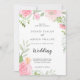 This spring peony front and back wedding invitation is perfect for an elegant wedding. The modern spring or summer design features simple watercolor pastel pink peonies and sage green leaves with a rustic country feel. Include more details (and optional online RSVP info) on the back of the card to save paper.
