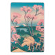 Japanese painting of people having a picnic under the cherry trees at spring blossom time, with Mount Fuji in the distance.