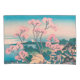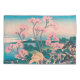 Japanese painting of people having a picnic under the cherry trees at spring blossom time, with Mount Fuji in the distance.