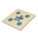 Hand-cut peach colour baby carriage with blue bow and blue ribbon and glued blue buttons on the wheels, light yellow background on Ceramic Photo Tile for kitchen and home decor. *Every things you see on the products are hand made, but you must know that you get a photo!