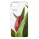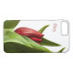 A cell phone case with a floral photograph of the Birth of a Spring Red Tulip surrounded by curved leaves against a white background. This nature photography will make a unique case/cover that can be personalised and customised. Use the template to easily change the text on the front to your name or initials. To change the font, size or colour, click on the "Customise it" button.