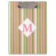 Spring Stripes Personalised Monogrammed Design. Stripes in shades of pink, green, and white. The monogram in dark pink coordinating with the dark pink in the design and the border of the diamond in the centre of the design. Perfect for a princess, little girl, teen girl, or girlie girl of any age.