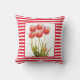 Decorate your outdoor living space with this stylish red tulip pillow. This pillow features a red and white striped background with an overlay of graphically designed tulip flowers. The backside is a solid red. Buy as shown with outdoor fabric or choose an indoor fabric. Feature tulip decorative pillows for spring season and for Easter or Mother's Day holiday.