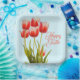 Spring paper plates with tulips. Pale blue colour plates with a bunch of red and white tulips with green leaves to decorate the centre. This big floral design will get you ready for warm weather and blooming flowers. Use for an Easter gathering, springtime birthday party, or for any reason. There is no wording to interrupt the pretty design. Plates come in round or square shapes, with other size options.