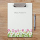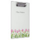This elegant spring clipboard features soft pink tulips and white daffodils arranged in a classic garden border along the bottom. Set against a light, airy background and personalized with your name, it brings refined botanical charm to everyday organization.