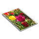 A beautiful variety of spring tulips at the Wooden Shoe Tulip Farm in Woodburn, Oregon. An up-close view of a pretty pink-purple tulip with other colourful tulips surrounding it. Photo taken April 2018.