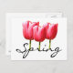 Celebrate Spring with this postcard displaying a trio of rose coloured tulips with a " Spring " text design.