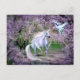 A delicately hued unicorn with lavender predominating in a similarly coloured blooming spring trees background and a fantasy bird celebration of a fantastical spring postcard