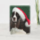 This is a Christmas Card featuring an original photograph of a beautiful, liver and white English Springer Spaniel wearing a Santa Hat with a green background. Be sure to view the matching postage stamp!
