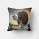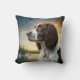 A springer spaniel dog with a brown and white coat gazes thoughtfully over a serene wetland landscape at dawn, where ducks take flight amidst tall reeds