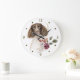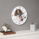 A portrait of a beautiful liver and white Springer Spaniel dog is just behind a pretty winter floral bouquet on this clock. Behind the image is a swirl of faux gold glitter. Dark gold numbers and diamond shaped markers around the perimeter make the clock easy to read. Perfect for anyone who has lost their heart to a spaniel.