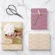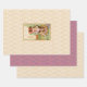 This set of 3 sheets of wrapping paper includes: one sheet with the postcard image superimposed on a gold and beige pattern, one sheet with a gold and beige overall pattern and one sheet with a pink and lavender overall pattern. The pattern size is consistent on all sheets included in the set.