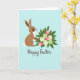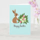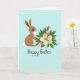 This card features a brown long-eared bunny with a white belly and a fluffy round tail, standing against a smooth pale blue background 🐰. Its large dark eyes and small curved smile give it a gentle, friendly look, as if it’s sharing a quiet moment with someone special. The bunny holds a full bouquet close to its chest with careful paws, like a sweet offering between friends. In the flowers, soft pink closed blooms sit beside pale green star-shaped blossoms, tucked among deep green leaves 🌷. The simple open space around the figure keeps the focus on the tender gesture and the cozy closeness it suggests. Near the bottom, a short Easter message appears centered in dark lettering, set in flowing cursive-style writing. The shapes are neatly defined with smooth edges and even color areas, keeping everything easy to read and visually calm. The bunny’s ears tilt slightly back while the bouquet fans outward in a rounded cluster, with the pink blooms rising above the green leaves.