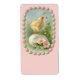 This charming vintage-style illustration features a fluffy yellow chick standing atop a large white egg adorned with soft greenery and delicate pink blossoms. The chick gently reaches toward a budding flower, surrounded by lush green leaves and two fully bloomed pink flowers resting at the base of the egg. The background is a soft, textured blend of pastel blue and green tones, enhancing the nostalgic feel of the artwork. Encircling the scene is a decorative border of speckled pastel eggs in alternating shades of pink and green, giving the piece a festive spring and Easter-inspired charm. The overall composition is smooth, softly shaded, and delicately detailed.