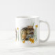 This mug features a cute little chipmunk who is stuffing his chubby cheeks as fast as he can on a spring day. He has a black and white stripe down his back, white around the eyes, golden brown fur, and a pink nose. The sweet little critter is surrounded by green grass and yellow lilies. The design is repeated left, centre and right.