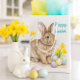 This gift bag showcases a digital color pencil drawing of a wild rabbit, vibrant Easter eggs, and yellow daffodil flowers, accompanied by a "Happy Easter" greeting. It can be purchased as a gift bag or the artwork can be applied to other products.