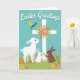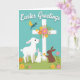 Designed with a soft teal background, this Easter card centers on a tall white upright shape decorated with clusters of pink, yellow, and orange flowers nestled among fresh green leaves. A grassy foreground sprinkled with tiny wildflowers sets a gentle spring scene where friendship feels close and easy 🌷. On the left, a white woolly animal stands calmly, its relaxed posture like a quiet chaperone to the moment. Near it, two fluffy long-eared rabbits share a tender exchange 🐰, with the smaller light-furred one offering a yellow blossom to its darker companion. Above them, a small bird sweeps through the air, its golden tail feathers catching the light as it arcs across the sky. A seasonal greeting appears near the top in flowing lettering, set in a darker tone that stands out clearly against the teal. The floral clusters wrap around the white centerpiece, with pink petals and yellow blooms layered over green sprigs in neat, outlined shapes. Always a joy to share Easter sentiments.