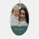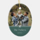 Sweet and simple oval-shaped Christmas photo ornament features a minimalist layout, with your family name and the year in clean, classic serif typeface on a spruce green background. A petite bow beneath your photo completes the design.