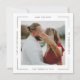 This modern and minimal Save the Date photo card features a white border with black text with all of the card details framing the photo. The square size stands out and makes a splash in a classic and elegant way. The back of the card has a place to share your wedding website details, along with a QR code for the website.