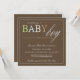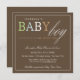 This invitation features the words "baby boy" in pretty pastel colours against a brown background. Baby shower details sit below.