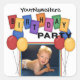 This design features a colourful frame surrounding a photo (upload your own photograph). On either side of the frame are red, yellow and blue balloons. Atop the frame sits colourful rectangles with "Birthday" inside of each one. There is customisable text to add your name or you can delete this field.