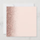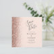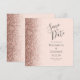 The left-hand edge of this elegant modern wedding save the date card features a rose gold faux glitter border. The customisable text combines charcoal grey handwriting, copperplate and italic fonts on a blush pink background. The reverse side features a matching blush pink and rose gold design.