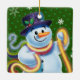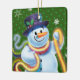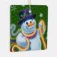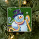Square shape green Christmas tree decoration Snowman and tinsel. Greens.