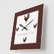 Square clock shown with colourful roosters standing at 12, 3, 6, 9 O'clock hours instead of numerals. Black hands with white centre and Bordeaux with golden camel trims/borders. Text reads "Blessings upon blessings for this house". Customise this item or buy as is. Stock image www.freepik.com