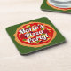 Square pepperoni pizza slice funny Birthday party beverage coaster. Add your own text, business name, company shop name, restaurant name or funny quote. Personalised template for men women and kids who love pizza. Fun design for pizza party, pizzeria, Italian restaurant, bar, cafe, shop, store, company, business, wedding etc. Big round pizza crust slice illustration with pepperoni, olives, tomato, cheese and mushrooms. Fast food design for pizza lovers. Green or custom colour background.