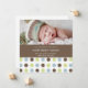 This super cute birth announcement features a landscape photo of your new addition on the top, a brown strip with baby's birth details underneath, and light blue, light green, and brown polkadots on the bottom.