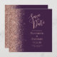 The left-hand edge of this elegant modern wedding save the date card features a rose gold faux glitter border. The customisable text combines rose pink handwriting, copperplate and italic fonts on a dark purple background. The reverse side features a matching navy blue and rose gold design.