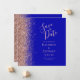 The left-hand edge of this elegant modern wedding save the date card features a rose gold faux glitter border. The customisable text combines pale rose gold blush-coloured handwriting, copperplate and italic fonts on a royal blue background. The reverse side features a matching royal blue and rose gold design.