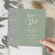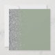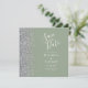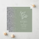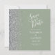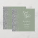 The left-hand edge of this elegant modern wedding save the date card features a silver faux glitter border. The customisable text combines white handwriting, copperplate and italic fonts on a sage green background. The reverse side features a matching sage green and silver design.