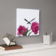 This is a square wall clock decorated with a photograph of beautiful pink tulips.