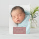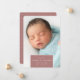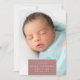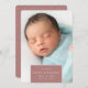 Chic and modern birth announcement features a single full bleed vertical/portrait orientated photo with a rectangular banner element at the bottom, bearing baby's name, birthdate, and birth stats. Add a personal message to the back, along with an additional photo.